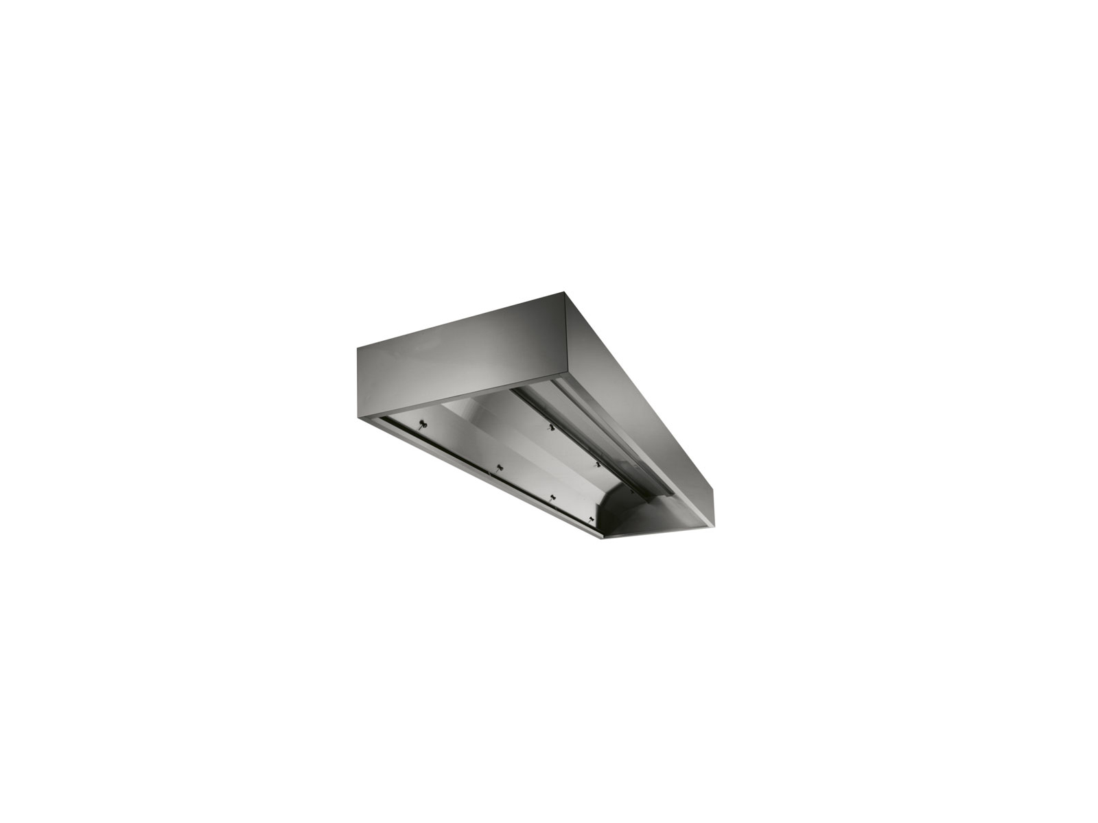 Den helt rostfria stålkonstruktionen gör denna fläktkåpa motståndskraftig mot fukt, ånga och fettpartiklar, som är vanliga i professionella kök. De yttre panelerna är designade med uppåtvända kanter, vilket minimerar risken för skador under rengöring och daglig användning. Monteringssystemet med ögonskruvar och skruvankare säkerställer en stabil och säker installation i taket, så att fläktkåpan förblir säkert monterad även under intensiv användning.