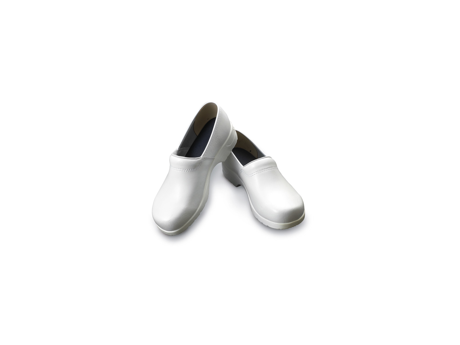Den antistatiska, halkfria PU-sulan ger ett säkert grepp på hala golv och är både olje- och bensinresistent. Sålen är dessutom värmebeständig upp till 140°C, vilket skyddar fötterna i varma arbetsmiljöer. Det vita lädermaterialet är inte bara estetiskt tilltalande utan också slitstarkt och lätt att rengöra, vilket är avgörande i miljöer med höga hygienkrav. Skon uppfyller säkerhetsstandarden EN ISO 20347:2012 O2 SRC.